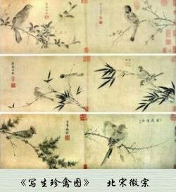 宋徽宗很喜欢画画,他画了很多花鸟画。当然从鉴定的角度上讲,有的专家认为有的画是代笔,但是有相当一部分画确实是他本人所为。比如,在2002年,嘉德拍卖会上拍了一幅宋徽宗的《写生珍禽图》,画的是花鸟,表明宋代人的一种追求,表明皇上心里的一个乐趣。画画得非常细致,都是花鸟。这幅画当时拍了2300万人民币,加上佣金是2530万。这幅画在国外流落了多年,终于回到祖国进行拍卖。但不幸的是,又被外国人买走了,在我们家门口晃了我们一下,没有真正回到祖国的怀抱,和我们照了一面,又被别人抱走了。