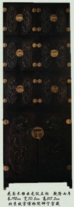 这一讲要讲中国人储物的家具,一般来说,就是指柜子。中国历史上现存最大的柜子在哪儿呢?是谁做的呢?我们有机会去故宫,可以去坤宁宫看看这对柜子。这对大柜是在乾隆七年(1742)制作完成的,当时有明确的档案记载。这个柜子有多高呢?5.2米高。像我这么高的人,如果踩着肩膀叠罗汉,第三个人才将将能够到柜子上沿。如果骑在脖子上叠的话,我估计得叠六层,才能拿到上面的东西。我想这样的柜子可能从制造到现在,上面几乎没放过东西。我也没有机会上去看看,也许有国宝藏在里头。最早摆放在坤宁宫的大柜是明代所做。当时是一对黑漆地堆灰罩金云龙柜,龙纹都是凸起的。后来因为柜子年久失修,乾隆皇帝下了御旨,用花梨木重新做了一对。为了追求原来的效果,就把这对柜子染成了黑色。远远地瞧,有点儿像紫檀。坤宁宫现在对外展出,虽然不能进去,但透过西面的玻璃,可以看到这对顶着天花板的柜子,非常壮观。二百六十多年来,这对柜子没有移动过位置,一直放在那里。