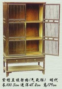 南方人跟北方人在柜类的名称上有些区别。南方人愿意叫橱,北方人愿意叫柜。我认为“橱”最早跟厨房有关,是用来储存食物的家具。“橱”字就是厨房的“厨”,加上“木”字边。南方经常可以看到一种窗棂状的橱,有一棂一棂的空隙,非常透气,里头搁了食物,不容易变馊。南方人给它起了一个很形象的名字,叫“鸡笼橱”。北方人又管它叫“气死猫”。这很有意思。北方人的视角是由外往里看:猫看到食物在里面,就是吃不着,所以叫“气死猫”。而南方人的视角是由里往外看:把鸡关在里面,叫“鸡笼橱”。视角不同,名称的叫法也不同。由于这种“气死猫”不但透气性好,还透视,很容易看到里面,所以它很早就被挪为书柜。今天我们使用的书柜一般有个玻璃门,都透明,为什么呢?就因为容易找到里面的书,一眼就看见了。