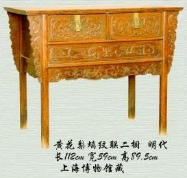 再有一种形制比较特殊的柜子,过去在北京的老户最多,今天看到的机会非常少。这种柜子是案形,两个门,上面带抽屉。如果有三个抽屉连着,叫“连三”;有两个抽屉连着,叫“连二”。但没有“连一”啊!它既可以当案,又可以当柜。