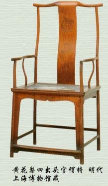 官帽椅,是中国椅具中最为舒展的椅具。官帽椅的名称也来自于宋朝,我们的椅子大部分宋朝就定型了。它是指搭脑两头伸出的地方,像宋代的官帽。我们欣赏宋代的人物画,都可以看到官帽旁边有两个大帽翅。官帽椅就取这个形象命名。这个官帽椅中,后来有很多变种,它还有一个俗名叫“四出头”,是指搭脑这两头,扶手两头,这四个位置都伸出一个头。