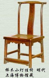 刚才讲到的椅具都是带有扶手,椅子里还有一种非常简单的形式,就是不带扶手,今天特别常用的椅子。这类椅子也有两种形制,一种靠背椅,搭脑的两端很圆滑,不出头,俗称“一统碑”。另外一种两端出头,叫“灯挂椅”,也很形象过去墙上有一些挂油灯的架子,掰过来就把油灯挂在这个位置,所以就叫灯挂椅,也很形象。