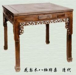 麻将牌,据说也是中国人的发明。这个发明的来历众说不一。有一种说法是,它是看粮仓的人发明出来的。因为麻将牌又叫“麻雀牌”,麻雀老来偷粮食,所以这些看粮仓的人就要赶麻雀。有人这么解释:麻将中的“索”(条),是捆麻雀的绳;“碰”,就是枪声;“万”,就是麻雀的数量,等等。所有术语都和这件事有关。还有人说是海上的人无聊时发明的,各种说法都有。麻将在晚清以后风靡中国,出现了大量牌桌。牌桌的用材一般都比较好,因为麻将要天天在上面拍来拍去,所以桌面较一般的桌子要厚,重量也比较大。