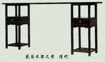 所谓架几案,就是两个几座上面架一块板。我们刚才说了,案是腿要缩进去,但现在大量的架几案是几座顶住两头摆。案子腿部缩回来,相应的,案面两端就要伸出去一块,行话叫“担出去”,意思是像挑担子一样伸出去一块。我们过去通过单纯的语言来传达信息时,人家就会跟我说:那儿有一个案子,担出去的部分比较长。我就知道具体位置了。
