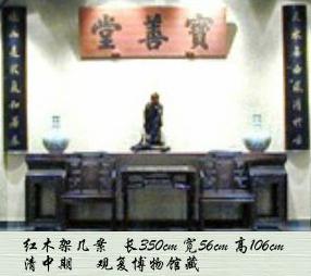 架几案的尺寸相对来说都比较大,因为它是三件一组,便于搬动,当时也非常流行。早年我在乡下见到很多架几案,但是真正使用优良木材,比如紫檀、黄花梨、红木的,相对来说非常少,尤其紫檀。大号的紫檀架几案基本都在故宫,就没出过宫。我碰到过非常大的红木架几案,将近四米,原来是北方制作,后来被南方人买到上海。但它在上海没有市场,因为买回去要往家里放,谁都嫌这家具尺寸过大,没有地方搁。买的商人本来认为这个架几案很值钱,可是买到上海以后谁都不要,他搁了两三年都卖不出去。我当时看到就特高兴,因为我想用它来做展览。所以当我表示出兴趣的时候,他觉得我是一个买主,就很便宜地卖给我了。这件红木架几案至今还在观复博物馆红木厅展览着,尺寸很大,也非常高。